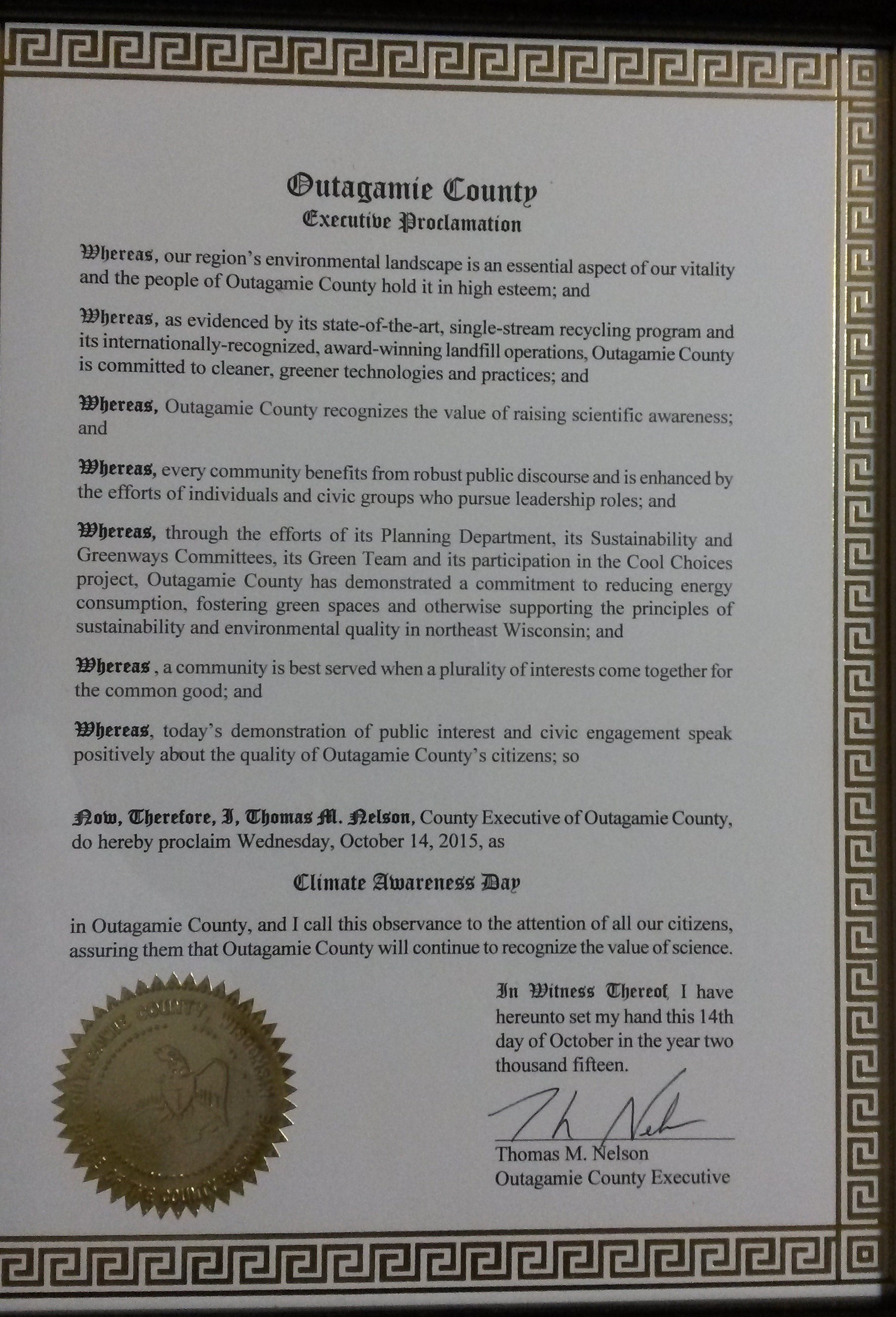 Outagamie County Executive Thomas Nelson spoke at the rally and presented a proclamation declaring October 14, 2015 as "Climate Awareness Day".
